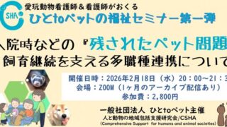 お知らせ ひとtoペットの福祉セミナー第1弾 入院時などの『残されたペット問題』 愛玩動物看護師&看護師がおくるひとtoペットの福祉セミナー第1弾入院時などの『残されたペット問題』 飼育継続を支える多職種連携についてペットがいるから入院しない!ひとり暮らしの飼い主が緊急搬送。そういえば…ペットがいなかったっけ?えっ?誰が... 2025.12.27 お知らせ人と動物の包括支援研究会